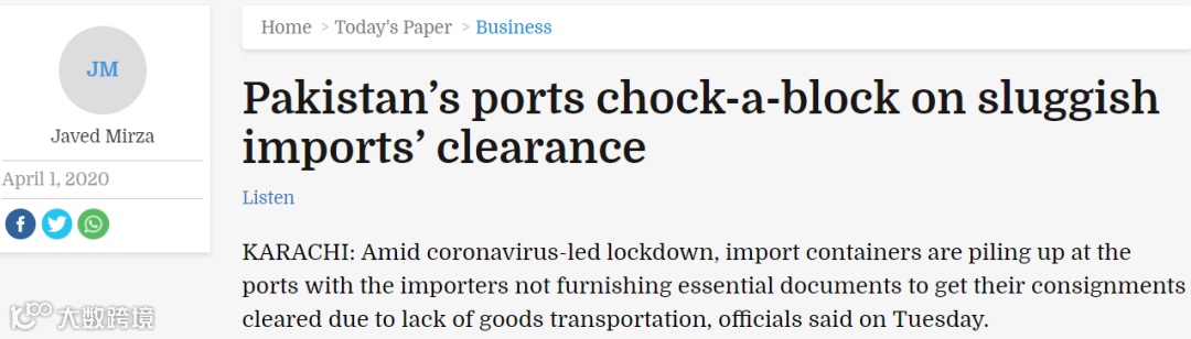 在巴基斯坦主要港口卡拉奇,当地官员周二表示,在冠状病毒导致的封锁中,进口商由于缺乏货物转运条件或没有办法提供必要的清关文件,导致货物集装箱快速在港口堆积。