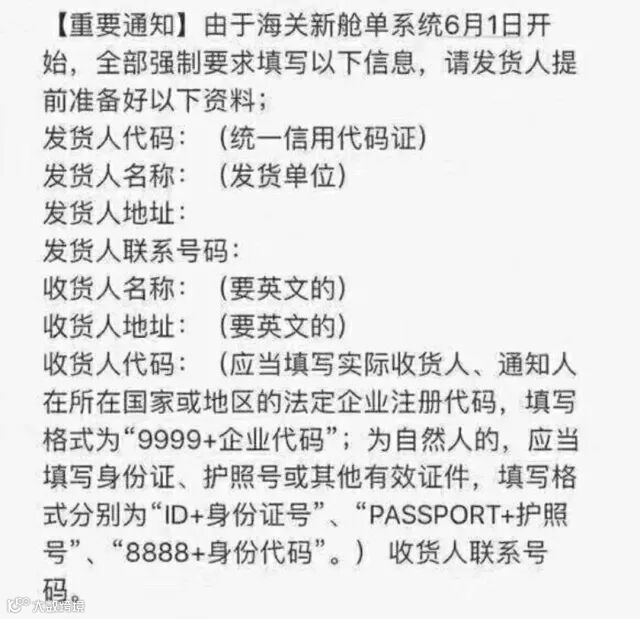 目前船公司、外运&外代等订舱口都已纷纷发出通知,将执行海关的相关规定,需要货主、货代在订舱时提供相关收发货人信息,请大家务必注意及时、准确的提供,否则可能会转为海关人工审核,查验几率高,会出现无法及时上船、货物被扣等严重的后果!