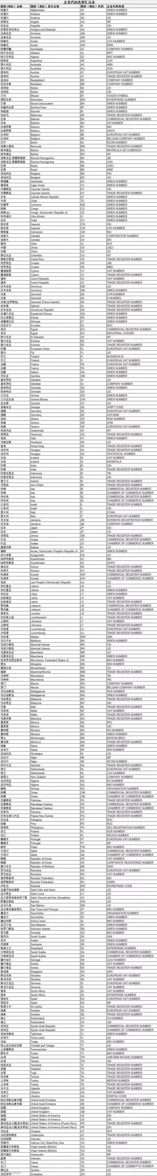 为什么这个代码表里面有的一个国家有多个企业代码类型呢?这个就像中国企业既有社会统一信用证代码,又有组织机构代码是一个道理,大家填写哪个代码类型都是可以的。各国收货企业代码大全详见文末。