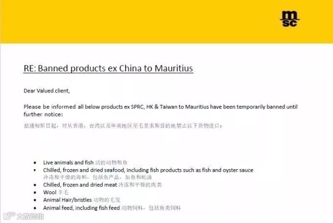 近日,全球第二大集装箱班轮公司地中海航运发出通知,2月6日起,毛里求斯决定对中国华南、香港以及台湾地区出口至该国的部分货物禁运!