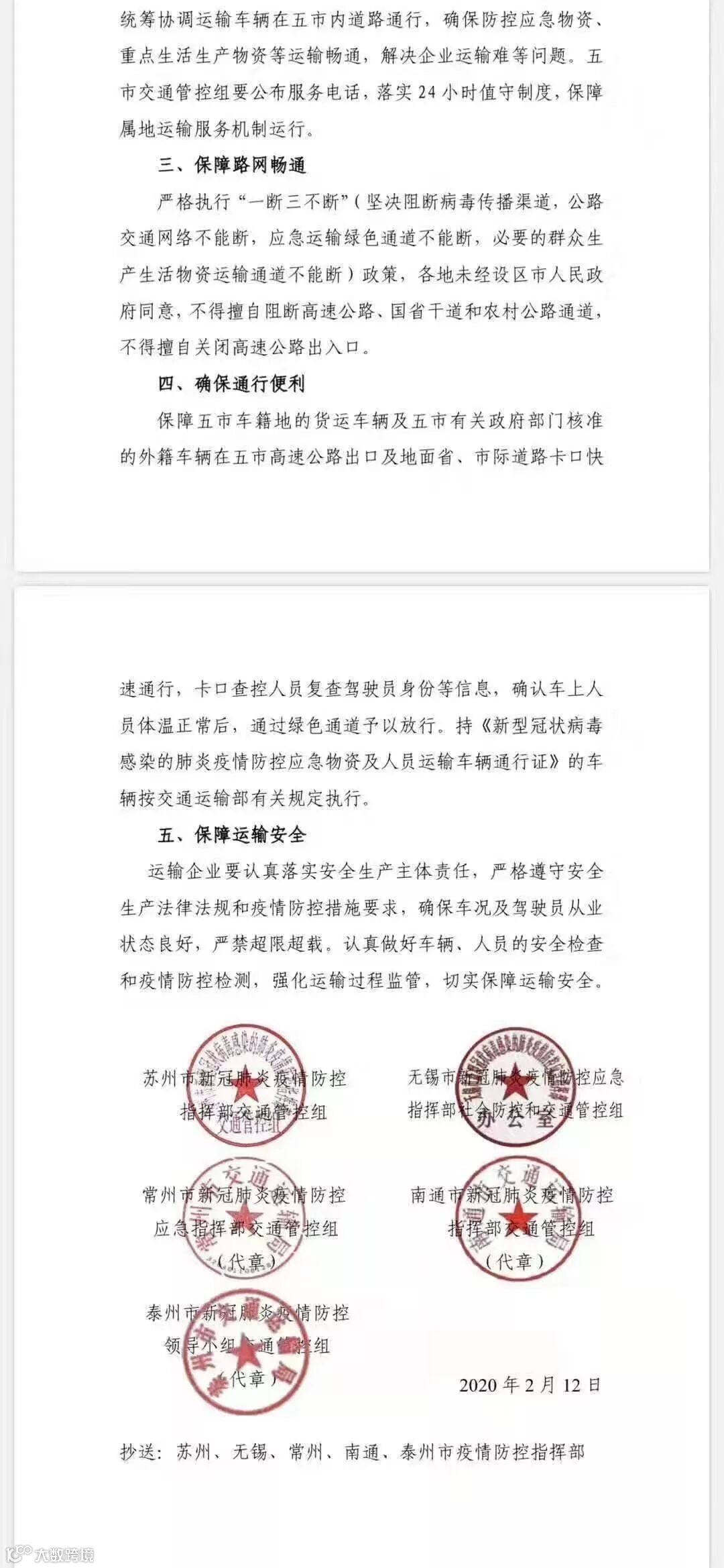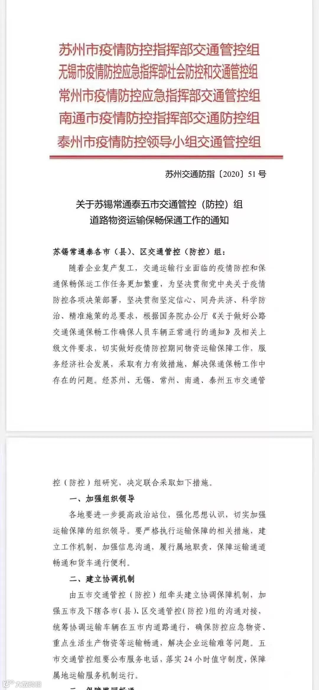 2月12日,苏州、无锡、常州、南通、泰州五市交通管控(防控)组发布道路物资运输保畅保通工作的通知,参考如下: