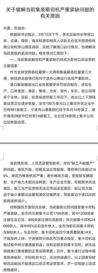 2月12日,宁波市口岸办发布《关于缓解当前集装箱司机严重紧缺问题的有关措施》,召集并帮助集卡司机尽快返岗,值得其他口岸“抄作业”,参考如下:
