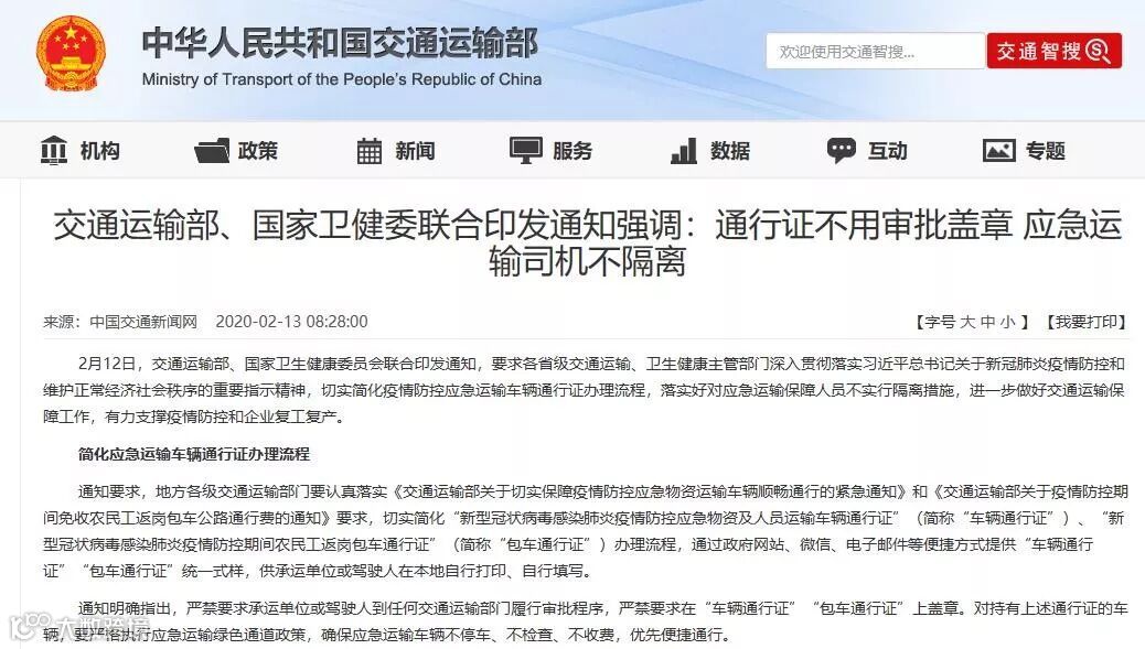 2月12日,交通运输部、国家卫生健康委员会联合印发通知,明确指出,严禁要求承运单位或驾驶人到任何交通运输部门履行审批程序,严禁要求在“车辆通行证”“包车通行证”上盖章。对持有上述通行证的车辆,要严格执行应急运输绿色通道政策,确保应急运输车辆不停车、不检查、不收费,优先便捷通行。