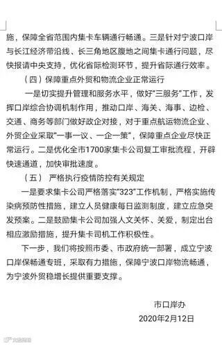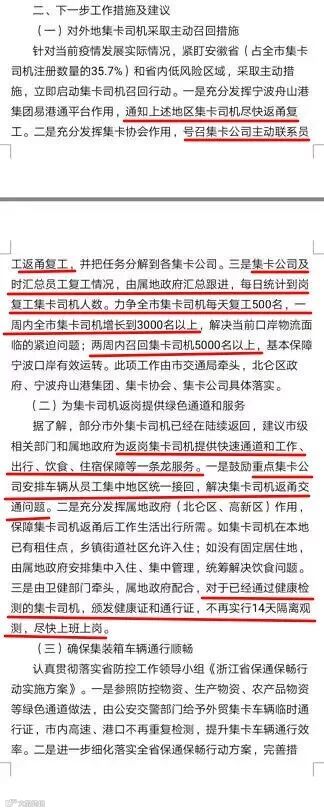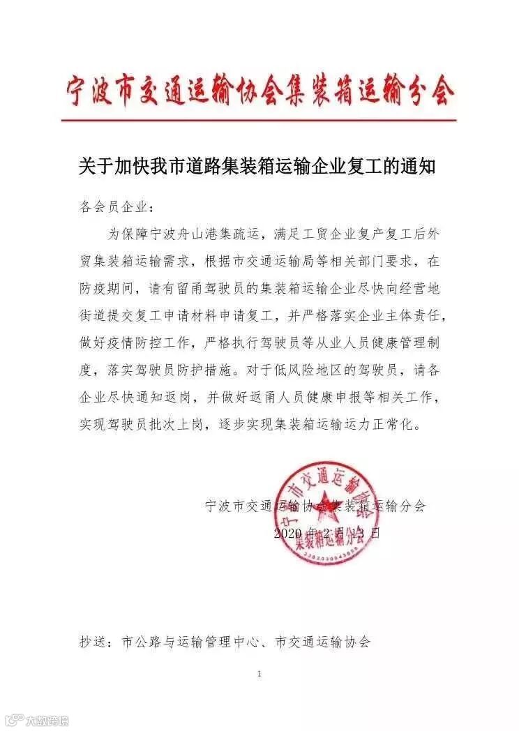 2月13日,宁波市交通运输协会集装箱运输分会发出《关于加快道路集装箱运输企业复工的通知》,参考如下: