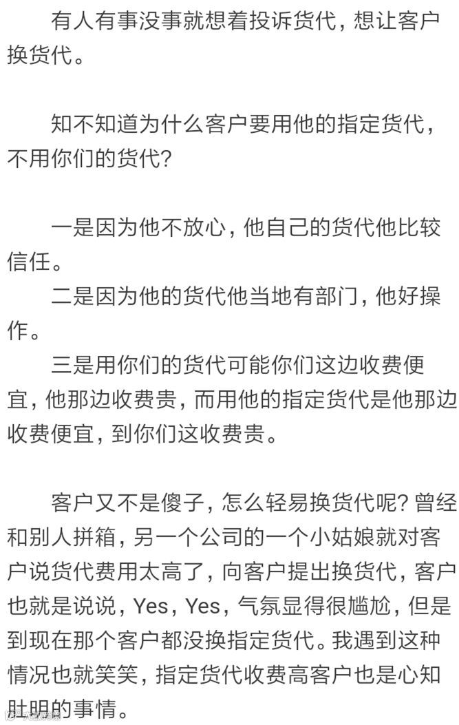 千万不要跟客户说,觉得价格高可以跟货代商量吗!为什么要跟客户说呢,伤了和气。其实货代发票寄过来之前是要经过你们同意的,会和你核对信息。开票之前金额就可以跟货代讨价还价。比如小编经常就把6000元的货代费用还到5200元左右。之后才同意货代说,你把票开过来吧,发票到了当天就安排款子,是可以讨价还价的。当然有些货代是还没来装之前就跟你说的,那么那个时候就要砍好价格。嫌贵你就好好说嘛,动不动向客户投诉货代干嘛。把本来不该归客户管的事情硬要让他管,只会客户觉得你们瞎胡闹,还麻烦他。