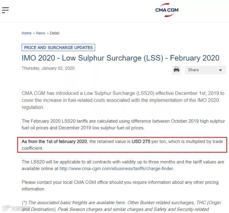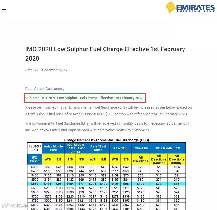 阿联酋航运发出通知,自2020年2月1日起,基于低硫燃料价格上升至每吨550美元至600美元之间。因此,环境燃油附加费 “Environmental Fuel Surcharge (EFS”) 将按以下标准增加。