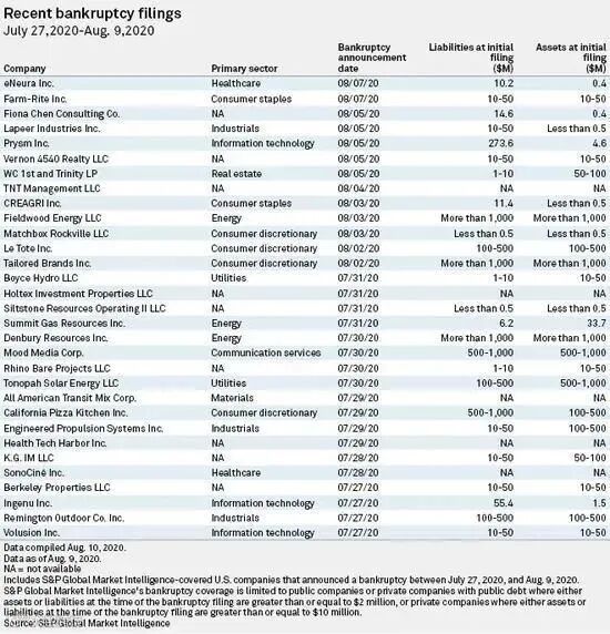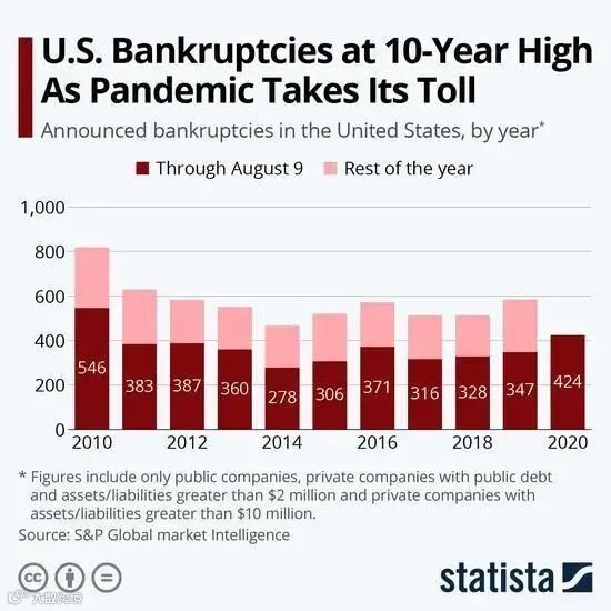 美国破产研究所(American Bankruptcy Institute)的数据,从2月中旬到7月31日,还仍然有800家小商业发起了第11章破产保护。