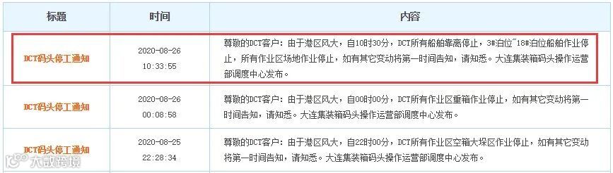 由于港区风大,自25日22时00分,DCT所有作业区空箱大垛区作业停止。自26日00时00分,DCT所有作业区重箱作业停止。