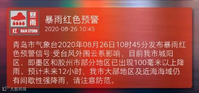 青岛市气象台2020年08月26日10时45分发布暴雨红色预警信号。预计未来12小时,青岛大部地区及近海海域仍有间歇性强降雨,请注意防范。