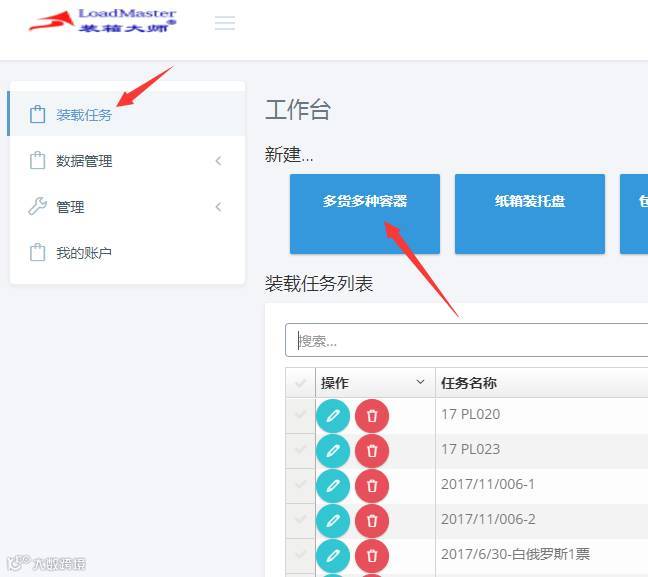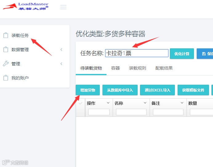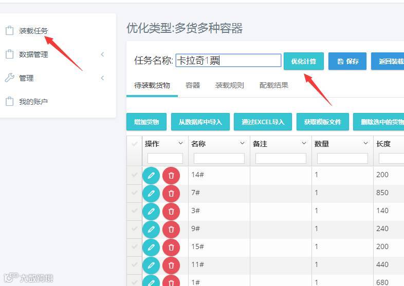 填上任务名称,以后好知道这是哪一票货物。然后根据客户提供的货物明细逐一的录入进去。名称、长度、宽度、高度、空间顺序、摆放方向,件数、是否可以叠加。