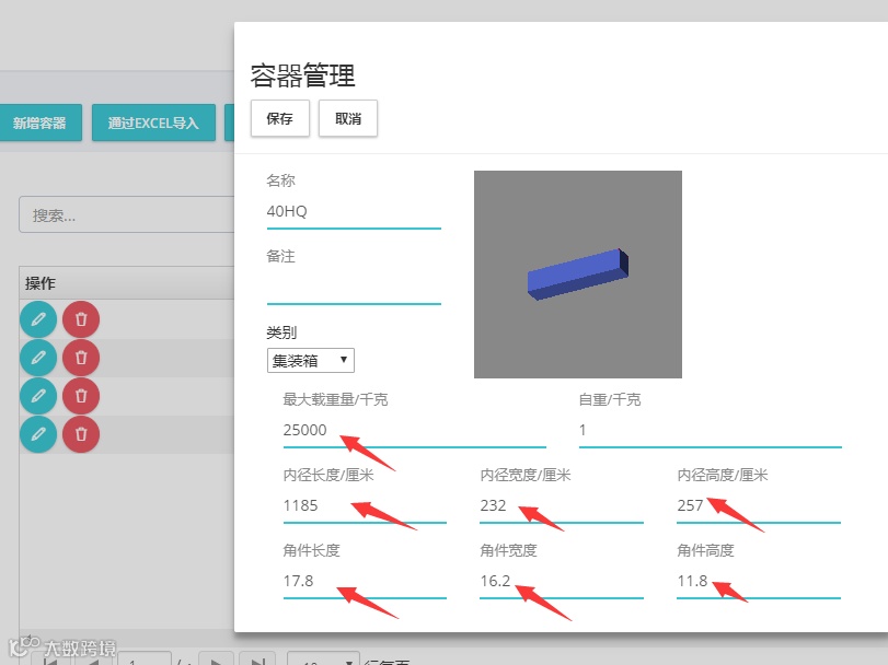 5添加装货的容器,这里就是把集装箱的尺寸添加进去就可以了。可以建立多种容器,比如20GP 、40GP 40HQ 等等。输入准确的尺寸。下图是 添加的40HQ的集装箱。