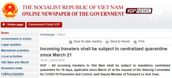 美国有线电视新闻网(CNN)21日援引越南政府网站消息称,为控制新型冠状病毒传播,自3月21日起,所有前往越南的旅客将集中隔离14天。