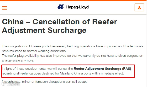 3月6日,赫伯罗特官网发布通知,由于中国港口的拥堵状况有所缓解,停泊作业有所改善,码头已恢复正常工作。冷藏插头的可用性也得到了改善,因此目前不必再大规模地转移货物。鉴于上述情况,HPL将即时取消所有运往中国内地港口的冷藏货物的冷藏调整附加费。