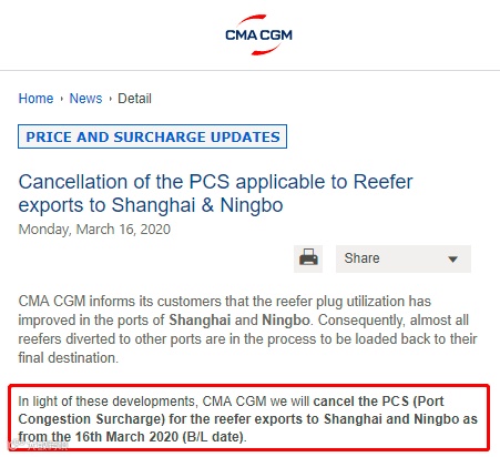 继赫伯罗特官网3月6日发布通知取消所有运往中国内地港口的冷藏货物的冷藏调整附加费后,达飞轮船通知客户,在上海和宁波的港口,冷冻机插头的利用率已经提高。因此,几乎所有转移到其他港口的冷藏船都在这个过程中被装载回它们的最终目的地。鉴于以上情况,达飞将从2020年3月16日起取消出口到上海和宁波的冷藏箱的PCS(港口拥挤附加费)。