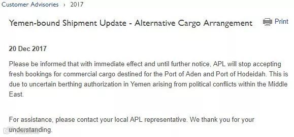 此前,APL发布通知,由于近期中东内部的政治冲突,导致也门的港口不确定能否继续开放。因此将立即停止接受预定到也门的亚丁港和荷台达的商业货物的新订单。