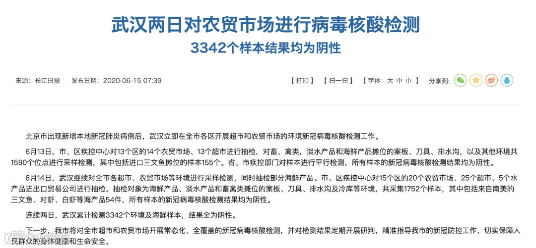 据武汉卫健委消息,北京市出现新增本地新冠肺炎病例后,武汉立即在全市各区开展超市和农贸市场的环境新冠病毒核酸检测工作,其中包括进口三文鱼摊位。连续两日,武汉累计检测3342个环境及海鲜样本,结果全为阴性。