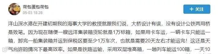 洋山港位于崎岖列岛的小洋山岛上!岛屿以秃岩为主,平地少。修建铁路对地形、地质构造要求高!在这样狭小的岛屿上修建铁路及货物转运站,需大量填海造陆,无论是对海洋生态的破坏还是铁路建设投资都是高昂的!