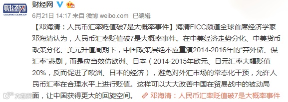九洲证券首席经济学家邓海清在研报中指出,央行应该放弃“保汇率、弃外储”的思想,减少对人民币汇率的干预。应效仿日本、欧洲,允许人民币汇率在合理水平上进行贬值。在特朗普首先“失信”的背景下,中美贸易问题愈演愈烈,彻底改变了人民币兑美元的均衡汇率基础,美国有错在先的情况下,没有理由指责中国汇率贬值。中国人民币汇率的贬值,反而可以大大改善中国在贸易战中的被动局面,获得更大的回旋空间。