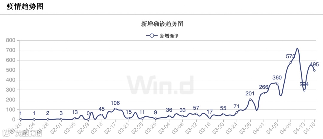 据日本放送协会(NHK)消息,当地时间16日0时至下午6时,日本当日新增新冠肺炎确诊病例283例,累计9005例。16日,东京都新增新冠肺炎确诊病例149例,累计达2595例。目前日本境内的新冠肺炎死亡病例为181例。Wind数据显示,日本新增确诊数量近期在高位徘徊。