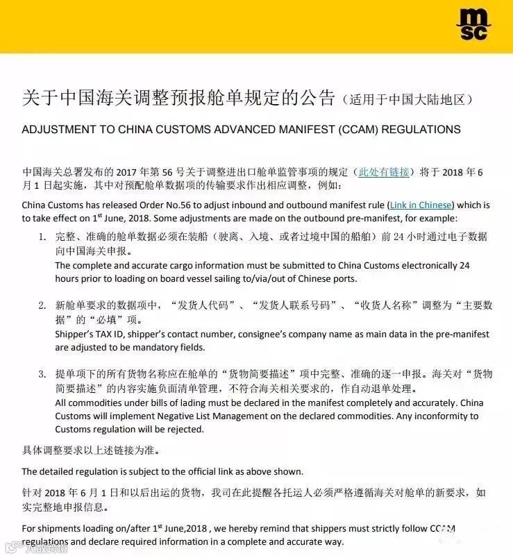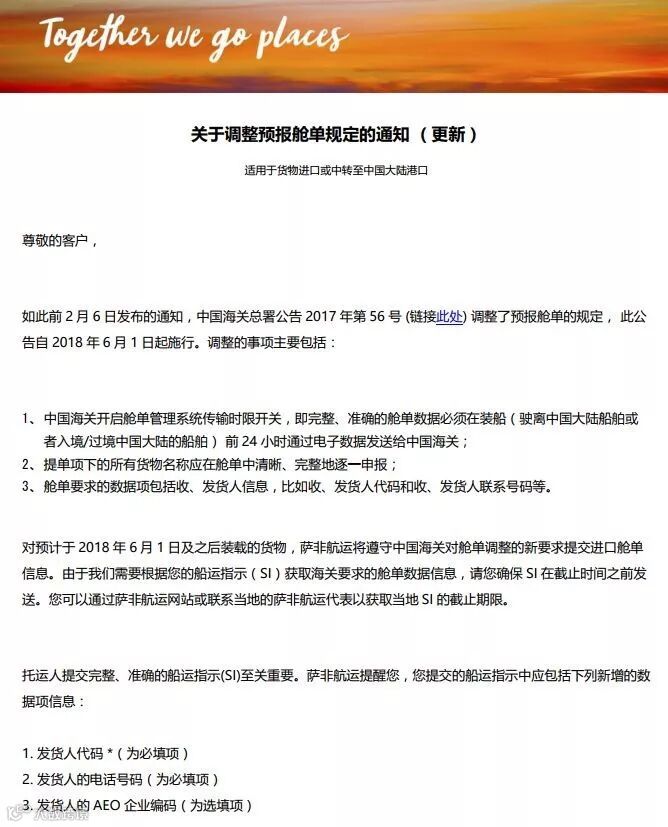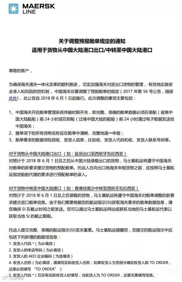 对预计于2018年6月1日及之后从中国大陆装载出口的货物,船公司将遵守中国海关对舱单的新要求提交货物的预配舱单。托运人在向出口地海关申报货物之前,应按照船公司指定船舶代理的要求进行预配舱单的录人。具体海关通知详见文末。