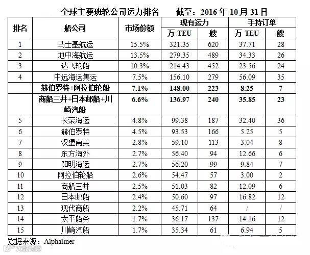 根据Aliphaliner最新公布的数据显示,赫伯罗特与阿拉伯轮船合并后运力共计148万TEU,占据全球运力份额的7.1%,位居全球第五。