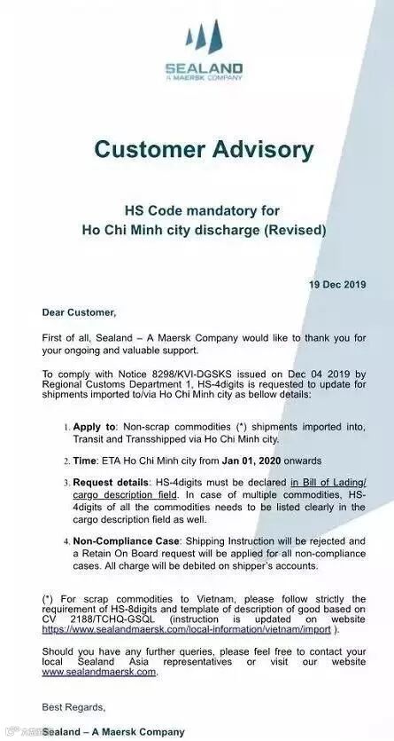 所有出口、转口到胡志明市的货物提单,无论主单、分单,最少要显示前四位海关编码(HSCODE)。