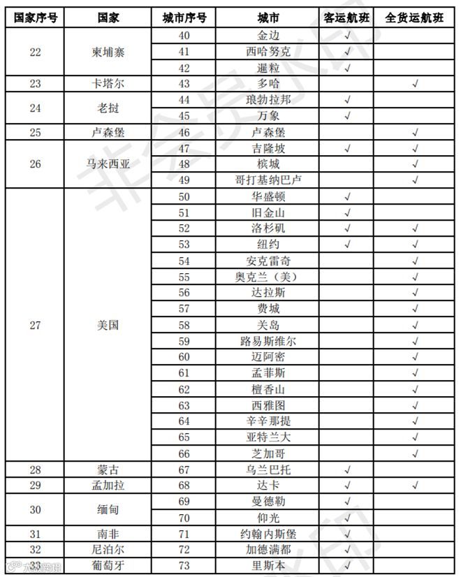 在这些客运航班中,由中方航空公司单方执飞的有26个国家,包括:埃及、澳大利亚、巴基斯坦、巴西、白俄罗斯、比利时、德国、法国、菲律宾、芬兰、荷兰、古巴、加拿大、美国、蒙古、南非、尼泊尔、葡萄牙、瑞典、乌兹别克斯坦、西班牙、希腊、匈牙利、新西兰、印度、英国。