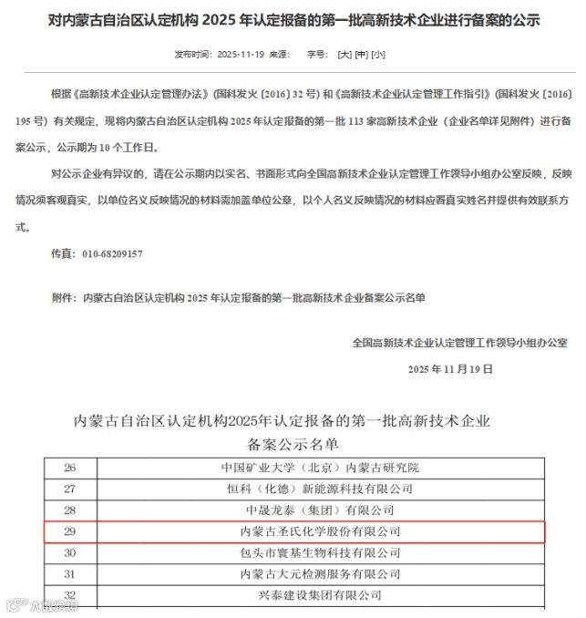 近日,全国高新技术企业认定管理工作领导小组办公室正式发布《对内蒙古自治区认定机构2025年认定报备的第一批高新技术企业进行备案的公示》,圣氏化学顺利通过“国家高新技术企业”复审。