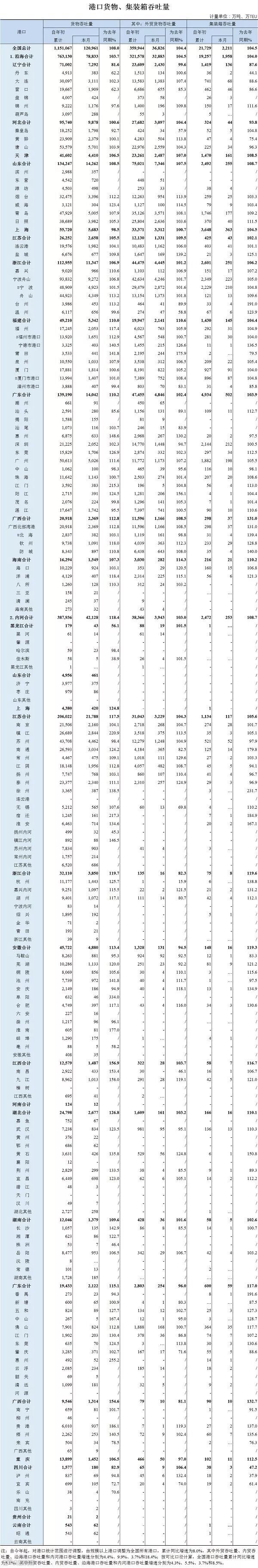 据统计数据,2019年10月,全国港口完成货物吞吐量120961万吨;2019年1-10月,全国港口完成货物吞吐量1151067万吨。累积同比增速为8.0%。