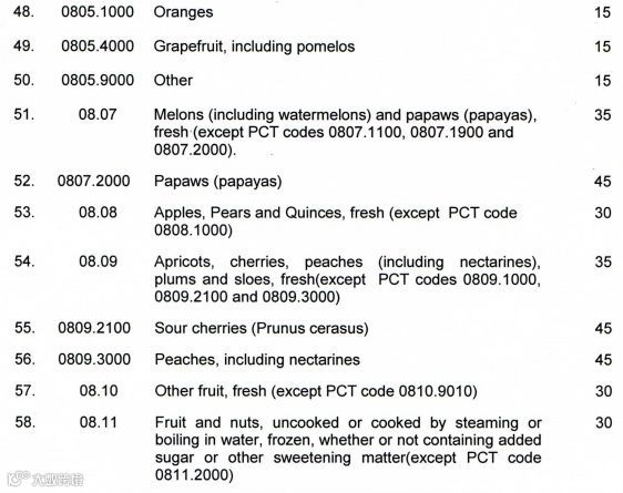 活禽10%,鱼类、牛奶和奶油提高至25%,酸奶、黄油、奶酪提高至20%,豆腐类提高至15%。小麦提高至60%,玉米30%,全麦面粉25%。通心粉原料、玉米、甜饼干、华夫饼和薄饼均提高至20%,烤面包、腌菜和西红柿也提高至20%,土豆50%,凤梨40%。蜂蜜、菠萝、鳄梨均提高至20%,番石榴和芒果15%,吉纳紫檀20%,西柚15%,柠檬20%以及西瓜40%。