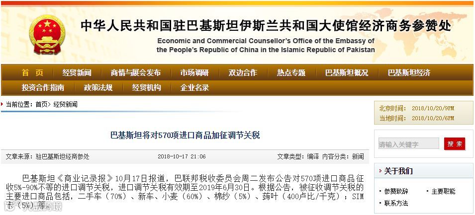 据中国驻巴基斯坦大使馆经济商务参赞处10月18日消息,巴基斯坦《商业记录报》17日报道,巴联邦税收委员会10月16日发布公告对570项进口商品征收5%-90%不等的进口调节关税,进口调节关税有效期至2019年6月30日。