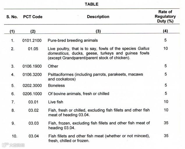 被征收调节关税的主要进口商品包括有二手车(70%)、新车、小麦(60%)、棉纱(5%)、蒟叶(400卢比/千克);SIM卡(5%)等。