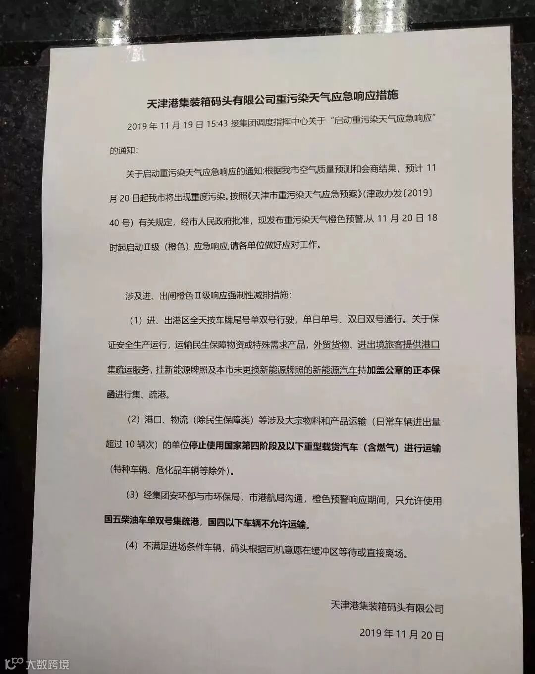 天津港昨天(11月20日)发布紧急通知:关于“启动重污染天气应急响应措施”。天津港从11月20日18时起启动Ⅱ级(橙色)应急响应,将对进出闸集装箱运输车辆做出严格限制!