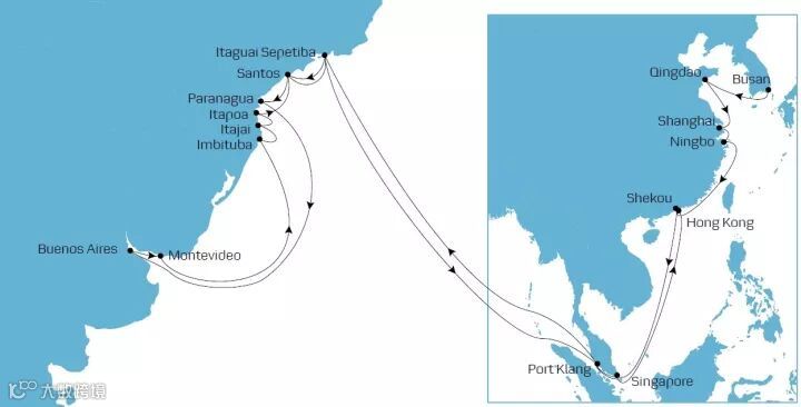 青岛至桑拖斯(巴西)缩短了16天。直接挂靠中国多个港口: 青岛(新增)、上海、宁波、蛇口以及香港。新增三个巴西直挂港口: 塞佩提巴、伊塔雅伊以及因比图巴。提供从塞佩提巴中转到玛瑙斯、培森以及苏阿普的航线服务。