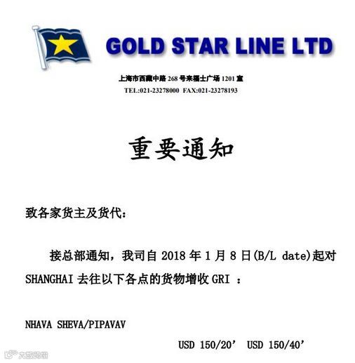 接总部通知,我司自2018年1月8日(B/L date)起对 SHANGHAI 去往以下各点的货物增收GRI: