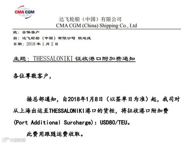 达飞轮船日前宣布,由于希腊Thessaloniki的港口堵塞问题严重,导致公司的营运成本不断增加,因为决定从2018年1月8日起,征收港口堵塞紧急附加费。