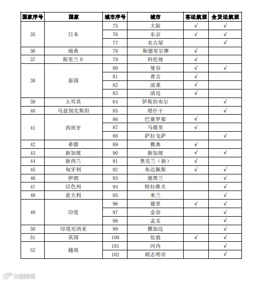 (1)上述客运航班中,由中方航空公司单方执飞的有27个国家,包括:埃及、奥地利、澳大利亚、巴基斯坦、白俄罗斯、比利时、波兰、丹麦、德国、法国、菲律宾、芬兰、荷兰、加拿大、美国、南非、尼泊尔、葡萄牙、瑞典、西班牙、希腊、新西兰、印度、英国、匈牙利、古巴、巴西。