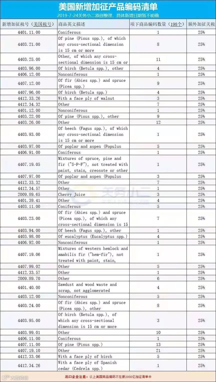 值得注意的是,近期美国突然将部分税号列入2000亿美元向中国商品加征关税的清单中。主要涉及产品:木及木制品196个编码、2209项下2个编码,预计原木及家具出口等,将受到较大影响。如有出口美国业务的外贸企业,请特别留意。据了解,美国贸易代表办公室(USTR)曾于2018年9月发布通知,其中单独说明会有商品额外列入到加征清单的事宜。但此前,相关部门和媒体都未对此进行关注和报道,导致众多外贸企业并不知情。
