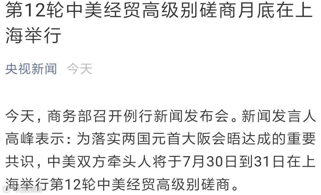 重大新闻,总是不期而至。7月25日下午,商务部放出大消息,第十二轮中美经贸高级别磋商来了,将在上海举行,时间是7月30日-31日。