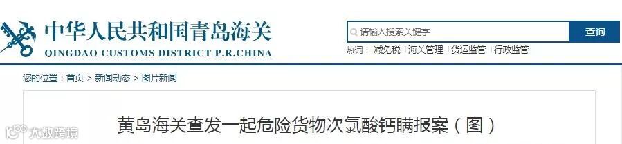 7月18日讯 青岛海关隶属黄岛海关再次查获一起瞒报危险货物次氯酸钙出口案,共计46吨,申报货值4.7万美元,为5.1类危险货物次氯酸钙。目前该企业已被立案调查,该案正在进一步办理中。
