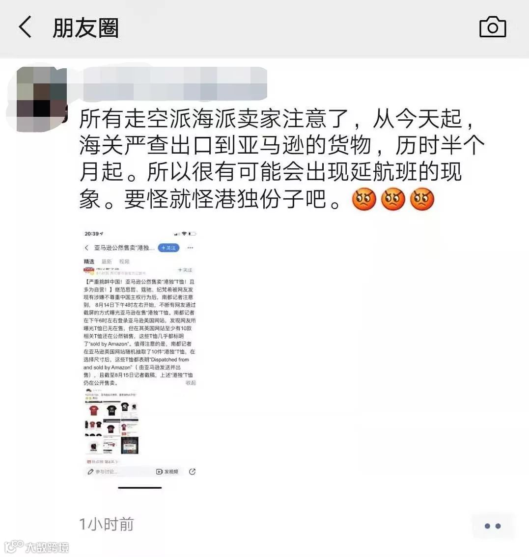 2、亚马逊平台公然售卖港独T恤,人民日报发出强烈警告!海关开始严查海派空派货物。海关查验率大幅上升。