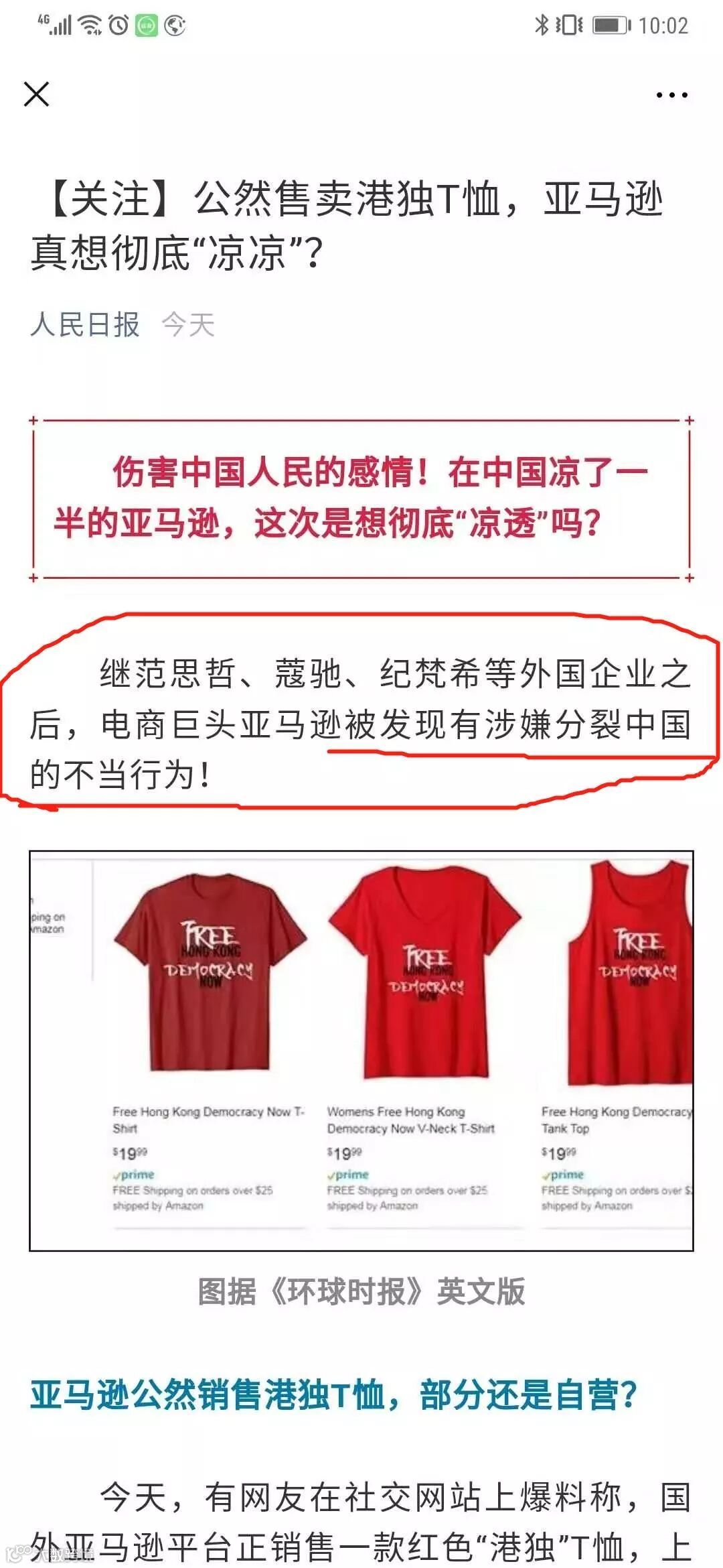 2、《人民日报》对亚马逊未对涉及亚马逊网站禁售产品示例中规定的“宣传、煽动或美化仇恨、暴力、种族或宗教敌视的商品”进行及时删除处理,从而对亚马逊平台发出了涉嫌分裂中国不当行为的强烈警告。这份警告火药味十分浓烈。