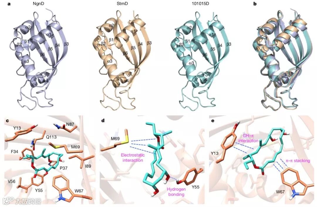 最后,研究者获得了StmD、NgnD和101015D三个蛋白的晶体来进一步研究该反应的催化机理。通过分子对接、计算机模拟和点突变实验,阐明了此类新型环加成酶的反应机制。M69中富含电子的硫原子会特定的指向过渡态中部分带正电的双烯部分,从而产生有利的静电作用;同时反应物中部分带负电的三烯酯会与W67上的芳香环产生π–π堆叠相互作用,来稳定过渡态并加速整个反应的进行。此外,Y55和Y13也会通过分子间氢键和CH–π相互作用来催化反应。