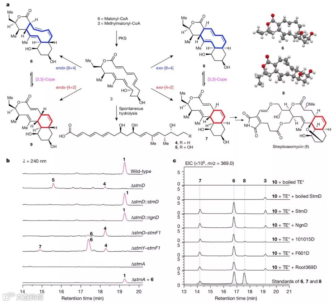 该团队在前期工作中,从海洋放线菌中发现了一个具有抗幽门螺旋杆菌活性的新颖大环内酯化合物命名为streptoseomycin,根据其结构推断,它在微生物体内的合成过程中可能涉及[4+2]环加成反应。为鉴定此过程,他们比较分析了streptoseomycin以及其结构类似物nargenicin的生物合成基因簇,推测一个未知功能的同源蛋白StmD、NgnD很有可能分别负责streptoseomycin和nargenicin中的环化反应。然而,敲除stmD 基因并未得到预料中的环化产物前体3,而得到了线性化合物4和5,这很可能是化合物3环内双键较多,张力较大,自发水解开环所致。研究人员设计了一个在微生物体内验证StmD功能的实验,首先敲除了基因簇上大部分基因,仅留下聚酮合成酶基因,此突变株只产生化合物4;当将stmD 基因回补回去时,得到了化合物6−8,其中化合物7不稳定,可经Cope重排转化成6。该结果表明,聚酮合成酶的直接产物是3,若无下游其它酶存在时,3将发生水解开环而生成4;若再引入StmD,则催化发生周环反应,奇怪的是,该酶不仅催化了[4+2]反应,也催化了[6+4]反应。