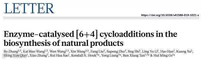 南京大学戈惠明、谭仁祥和梁勇研究团队首次鉴定出能够催化[6+4]环加成反应的一类酶家族,相关成果“Enzyme-catalysed [6+4] cycloadditions in the biosynthesis of natural products”2019年3月13日在线发表在Nature 杂志上。南京大学助理研究员张博博士、以及博士研究生王凯标、王文和汪欣为该论文共同第一作者。戈惠明、谭仁祥、梁勇以及加州大学洛杉矶分校的Kendall N. Houk教授为共同通讯作者。