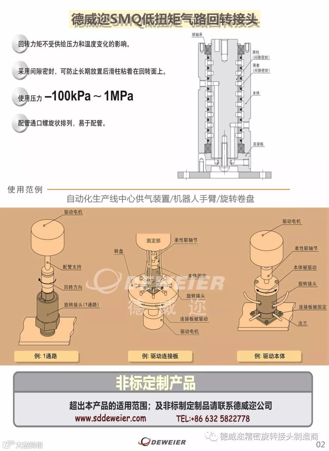 德威迩精密旋转接头制造商德威迩气动旋转接头主要用于自动化生产线中心供气装置/机器人手臂/旋转卷盘以及 冶金机械,轧路机械,造纸机械,建筑机械等众多行业。