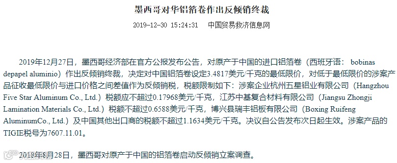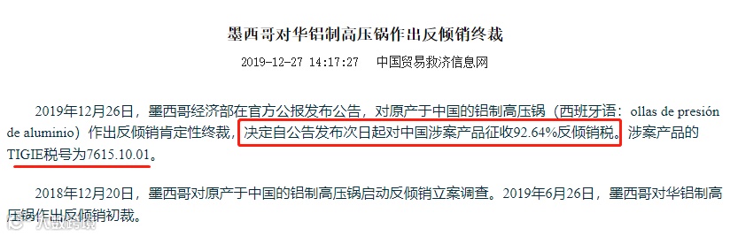 据报道,12月27日墨西哥经济部宣布,将对原产于中国的铝箔纸卷以及铝制高压锅产品加收费用,费率最高达92.64%,原因是中国出口到当地的铝制压力锅价格低于上限设定的每公斤3.4817美元。