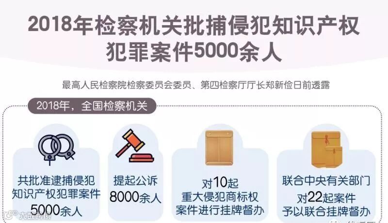 国家亮剑,严打侵权。2018年检查机关批捕侵犯知识产权犯罪案件5000余人,2019年新一轮开展“龙腾行动”等,再次加大了知识产权刑事司法保护力度。