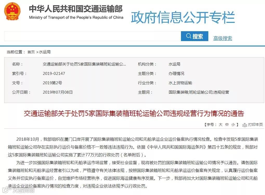 交通运输部官网7月8日发布《交通运输部关于处罚5家国际集装箱班轮运输公司违规经营行为情况的通告》。