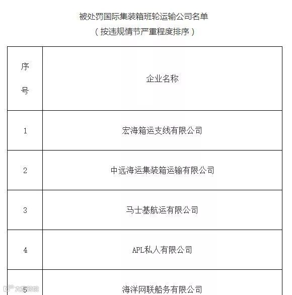 这5家被处罚的公司包括:宏海箱运支线有限公司、中远海运集装箱运输有限公司、马士基航运有限公司、APL私人有限公司、海洋网联船务有限公司。